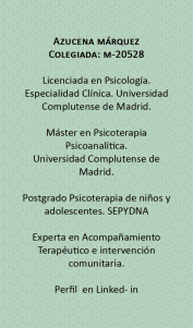 Licenciada en psicología clínica. Master en psicoterapia psicoanalitica. Posgrado en niños y adolescentes.
